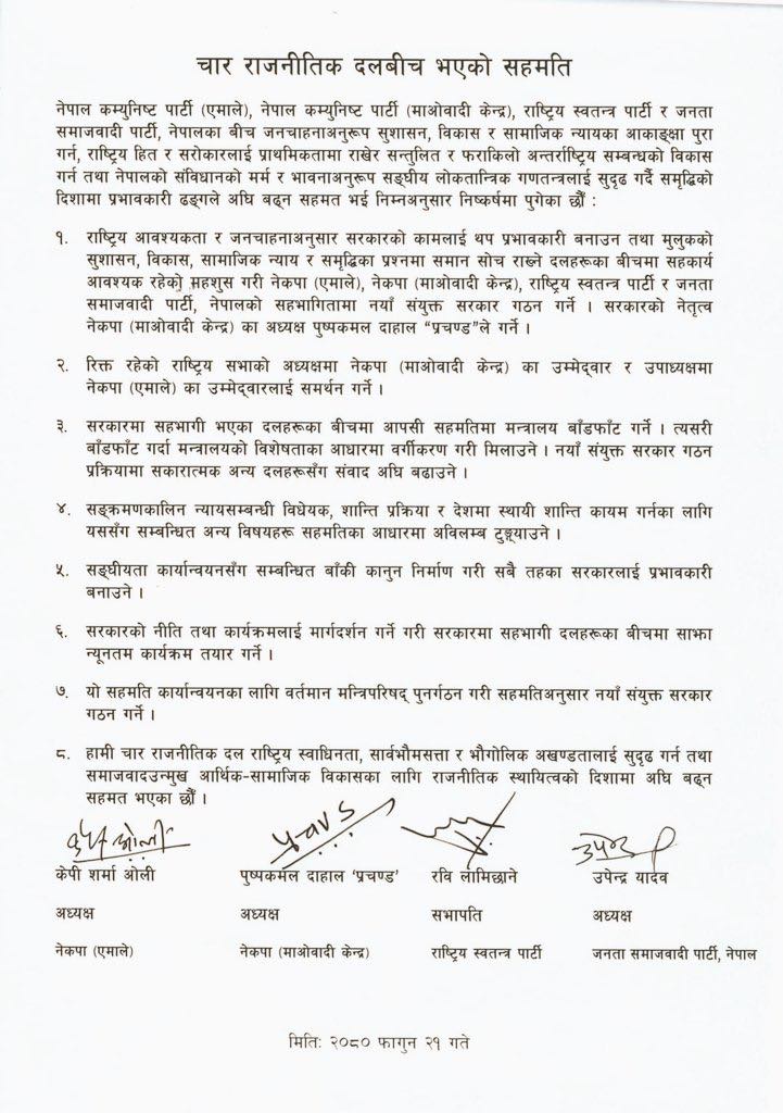 शिर्ष नेताले हस्ताक्षर गरेको सहमति पत्रमा चारै दलको सहभागितामा नयाँ सरकार गठन गर्ने र प्रधानमन्त्री पुष्पकमल दाहाल प्रचण्ड रहने,राष्ट्रिय सभा अध्यक्ष माओवादी र उपाध्यक्ष एमालेले लिने,संक्रमणकालीन न्याय, शान्ति प्रक्रिया सहमतिका आधारमा टुंग्याउने सहमति भएको उल्लेख छ ।