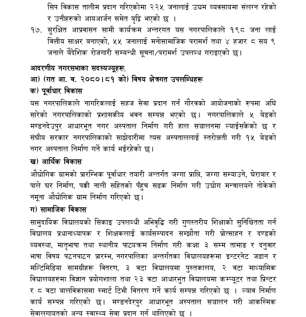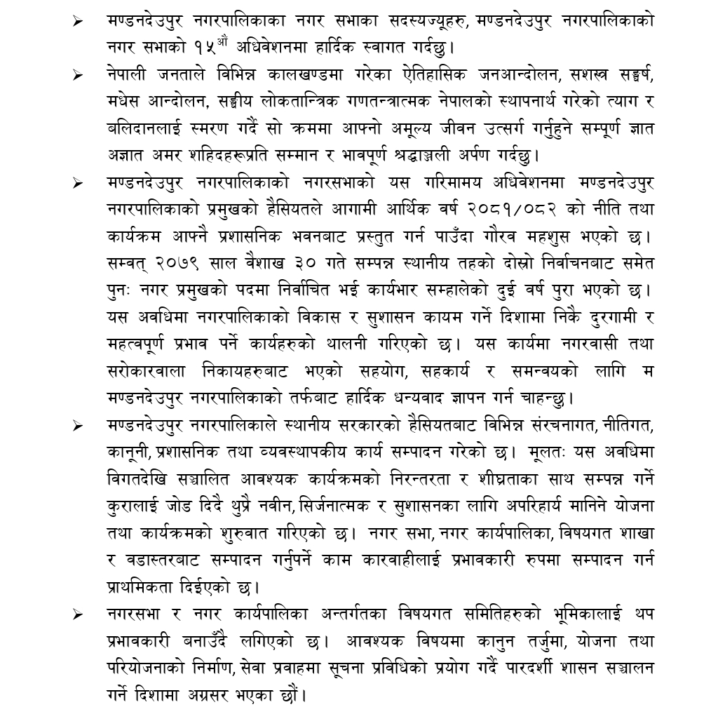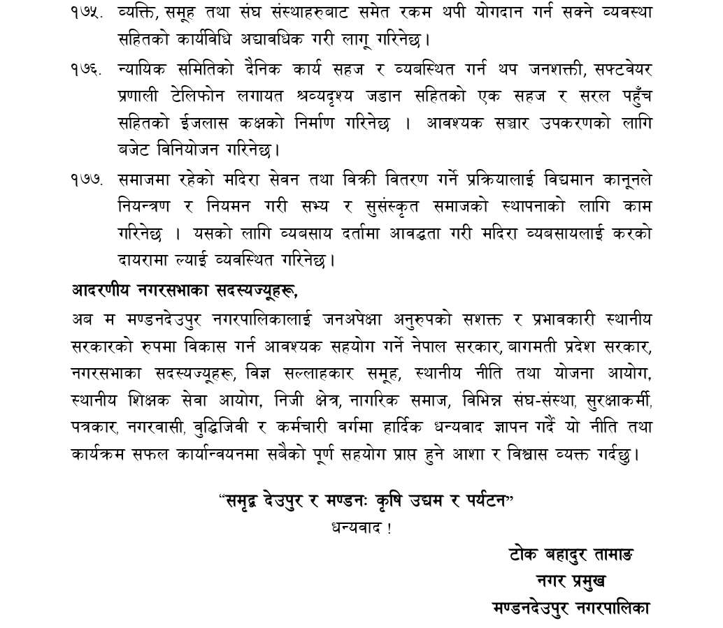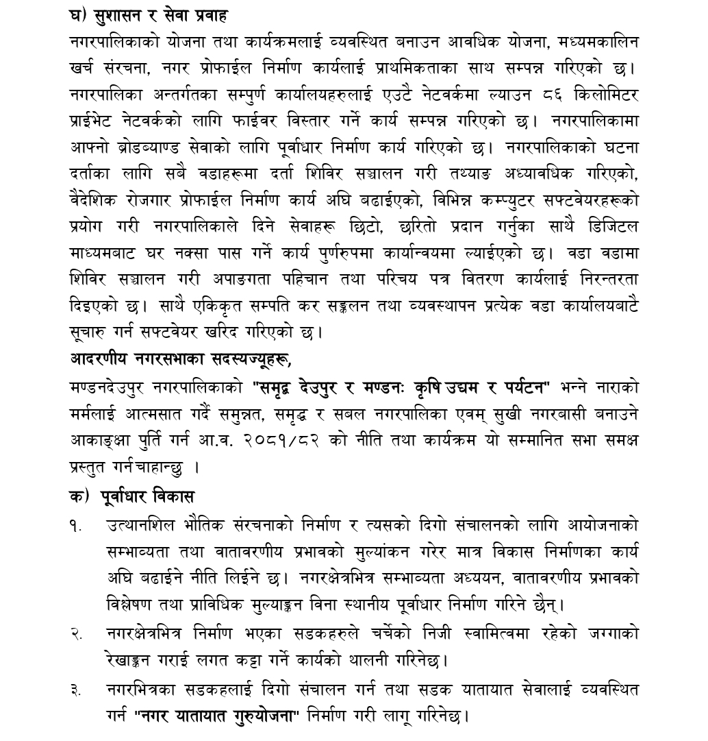 काभ्रेपलाञ्चोकको मण्डनदेउपुर नगरपालिकाको नगरसभाको १५ औं अधिवशेनमा नगर प्रमुख टोक बहादुर वाइबाद्धारा प्रस्तुत आ.व.२०८१/०८२ को नीति तथा कार्यक्रमको पूर्णपाठ :-