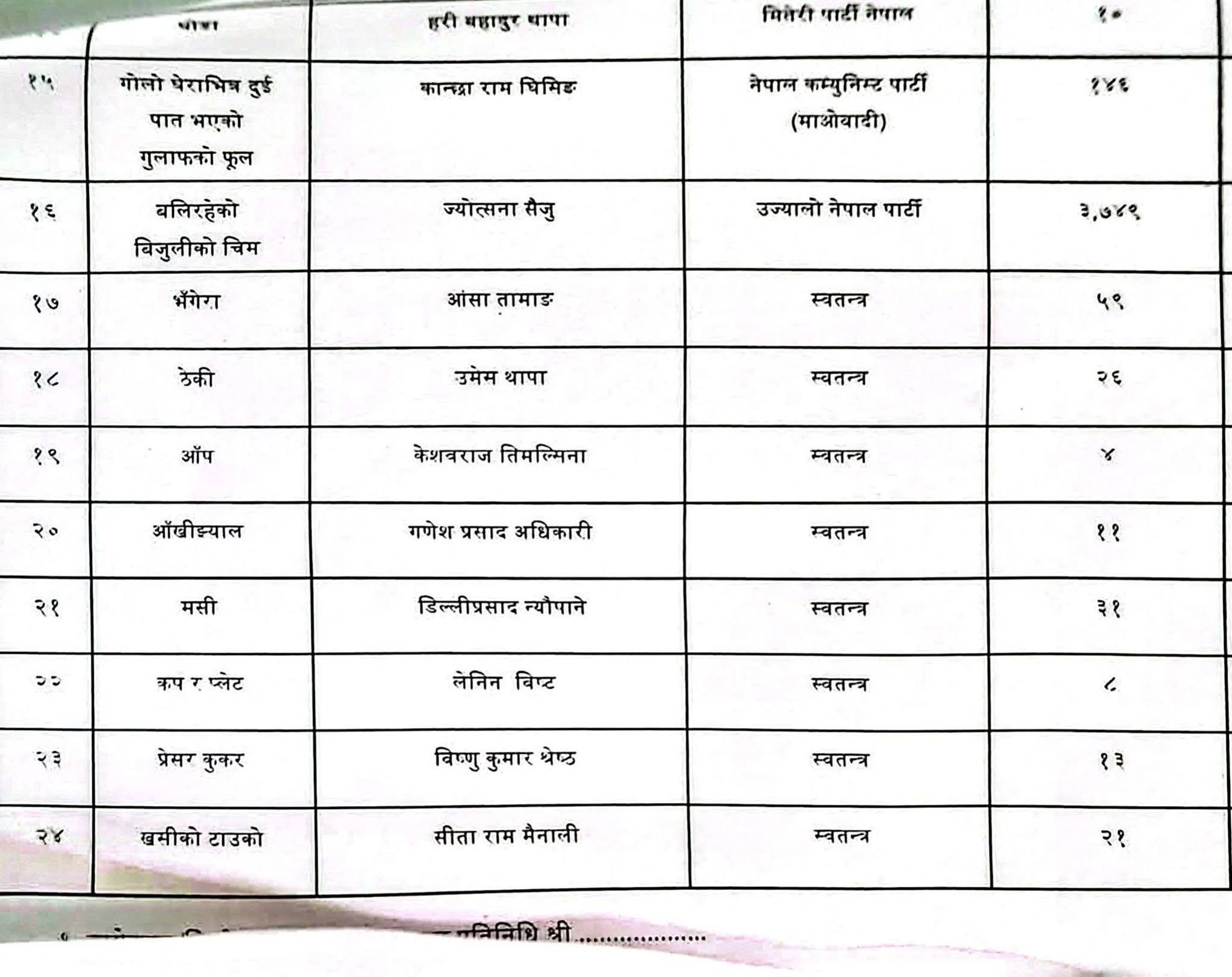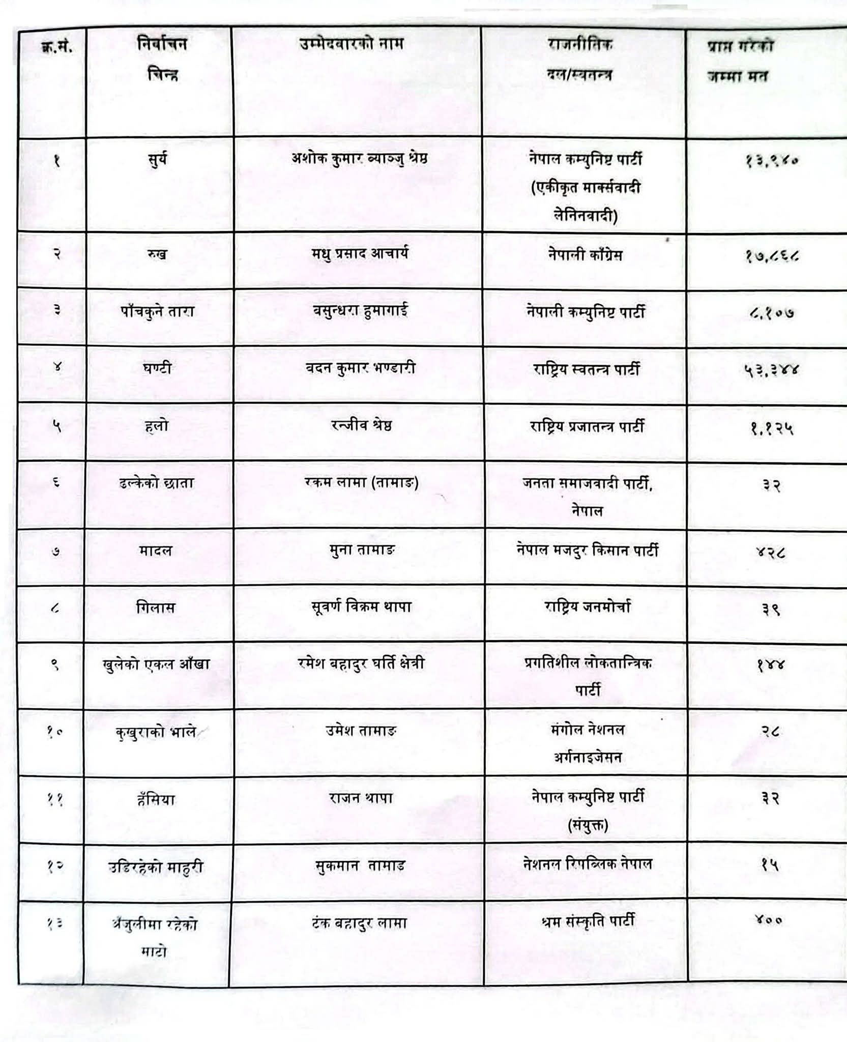 अपराह्न सम्पन्न मत गणना अनुसार नेपाली काँग्रेका उम्मेदवार मधु आचर्यले १७ हजार ८६८ मत प्राप्त गर्नुभयो भने नेकपा एमालेका अशोक ब्यन्जुले १३ हजार ९४० मत प्राप्त गर्नुभयो ।